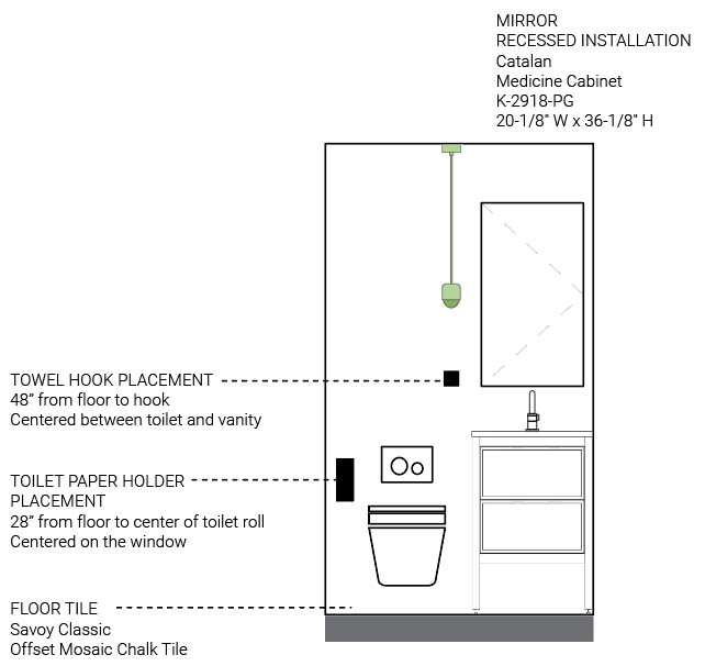 When toilet is hung, account for the thicker seat for final height; ~18″ from the top of the seat to the floor.