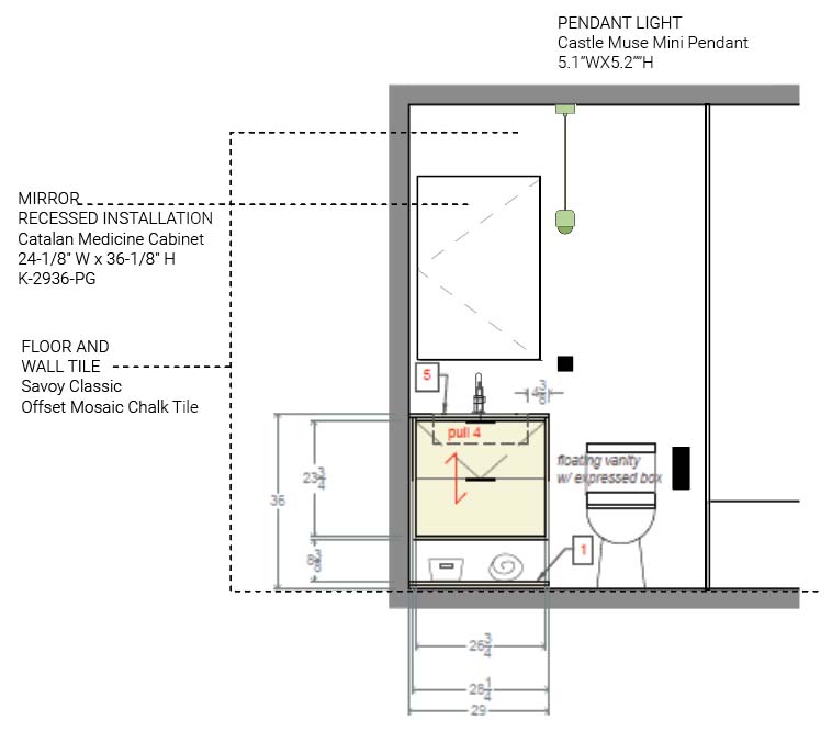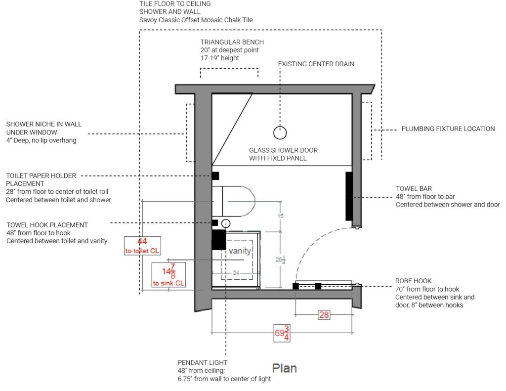 3cm slab counter with undermount sink; 4″ Shower shelf; Countertop material might be better to use for the bench as well to provide a solid surface