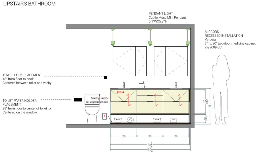 Recessed installation; Mirror placement to allow clearance for faucets; Hinges adjust for right and left placement; Larger side of mirror centered on the sink